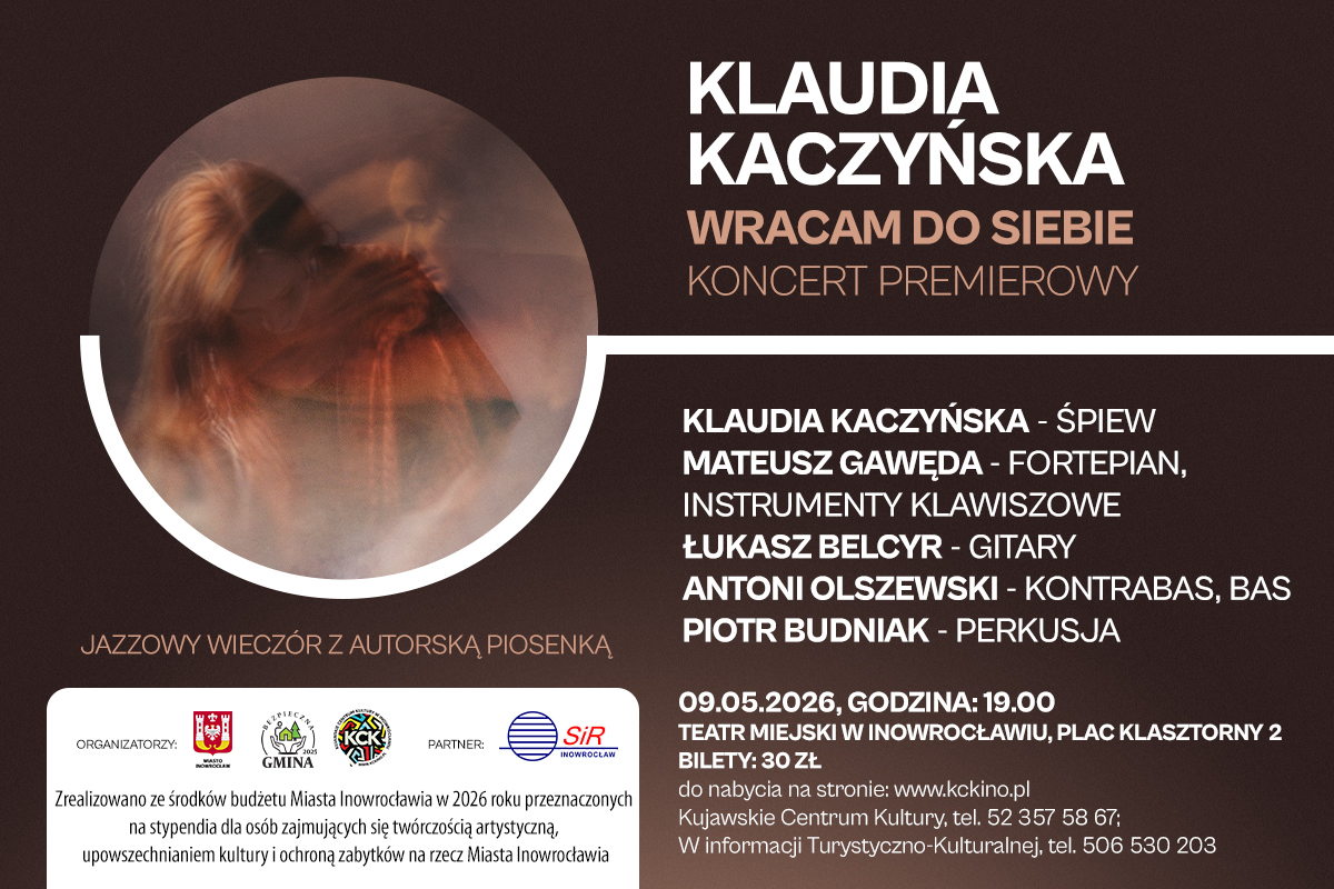 Prezydent Miasta Inowrocławia Arkadiusz Fajok zaprasza na jazzowy wieczór z autorską muzyką o życiu, przemianach i szukaniu własnych ścieżek. Wydarzenie będzie promować debiutancką płytę „Wracam do siebie” Klaudii Kaczyńskiej.