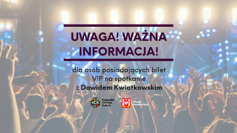 Kujawskie Centrum Kultury – Organizator koncertu Dawida Kwiatkowskiego w Inowrocławiu – uprzejmie informuje, że spotkanie z Dawidem Kwiatkowskim w ramach zakupionego biletu VIP, odbędzie się przed koncertem, dnia 14 sierpnia 2020 r. o godzinie 15:00 w Teatrze Miejskim w Inowrocławiu przy ulicy plac Klasztorny 2. Podczas spotkania każdy z uczestników będzie mógł indywidualnie porozmawiać z…