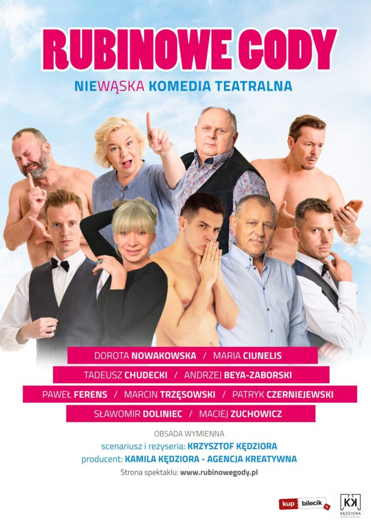 Czy czterdziesta rocznica ślubu małżeństwa z prowincji może stać się mimowolną okazją do udziału w intrydze na szczytach władz?  Grażyna i Marian po raz pierwszy w życiu wyjeżdżają razem do luksusowego hotelu, by czterdziestą rocznicę ślubu uczcić inaczej, niż wszystkie poprzednie. I z pewnością wspólny weekend dałoby się jakoś przecierpieć, gdyby nie tajemniczy gość spod łóżka, oraz portier, który zależność pomiędzy państwem z- i spod łóżka definiuje jako erotyczny trójkąt, będący odskocznią od szarej, małżeńskiej codzienności. Czy naszych bohaterów czeka polityczny skandal na szczytach władzy? I kto wyjdzie obronną ręką z sytuacji, która dla wszystkich stron jest niekomfortowa? „Rubinowe gody” to opowieść o tym, jak jeden wieczór może zmienić nasze życie poprzez splot zupełnie niespodziewanych zdarzeń, ale również mądra lekcja: że na miłość i namiętność nigdy nie jest za późno.