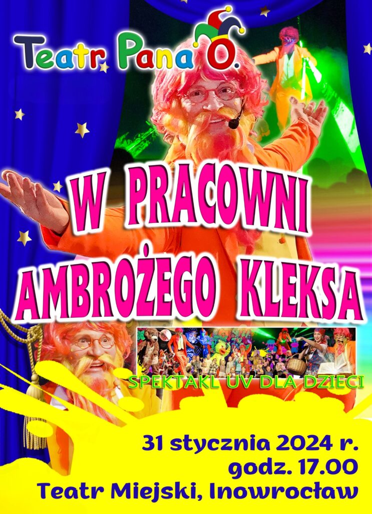 Teatr Pana O. wraz z Ambrożym Kleksem zabierze wszystkich do roztańczonej, rozśpiewanej i pełnej magii pracowni Profesora Kleksa. Podczas niezwykłego spektaklu postacie wchodzą w interakcje z publicznością. Spektakl ten został stworzony z myślą o najmłodszych, by oprócz niepowtarzalnych wrażeń wizualnych, mogli poznać bliżej twórczość Jana Brzechwy. Takie połączenie polskiej klasyki literatury dziecięcej z unikalnym widowiskiem teatralnym z pewnością pozostanie na długo w pamięci wszystkich dzieci.